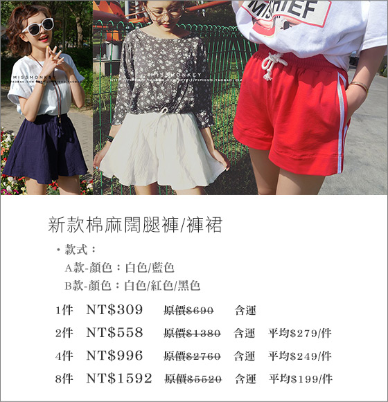 商品訊息簡述: 平均每件最低只要199元起(含運)即可購得新款棉麻闊腿褲/褲裙1件/2件/4件/8件,多款多色任選?